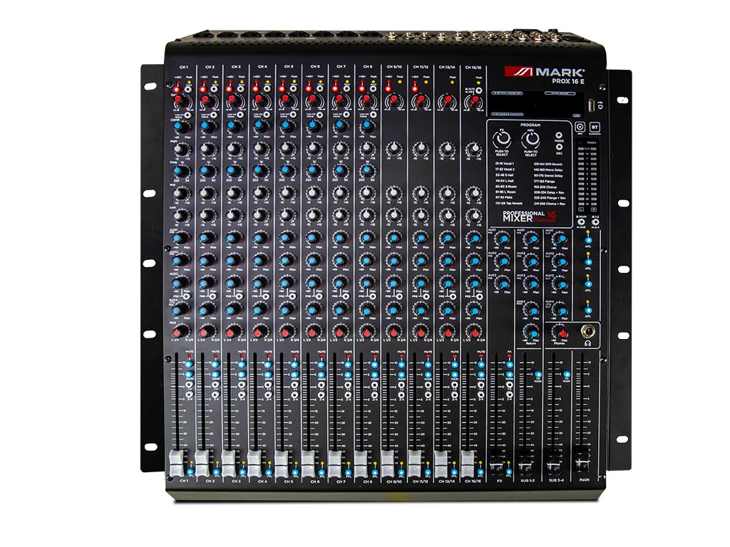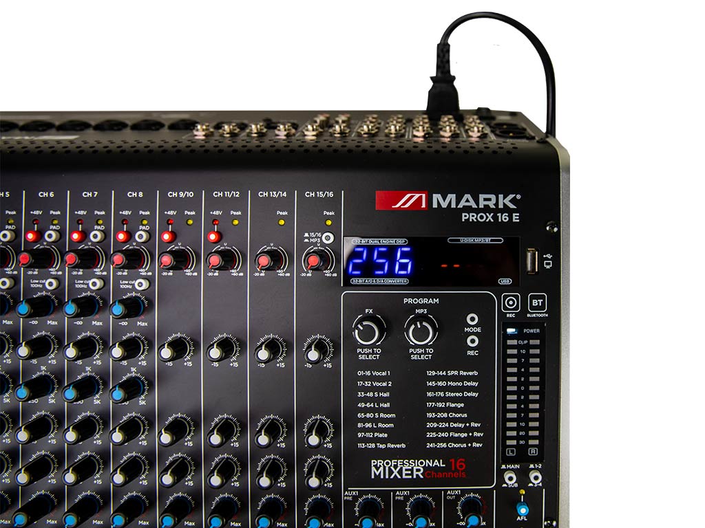 Cód. PROX 16E Mark – PROX 16E – Mezclador analógico 16 canales con USB/BT El mezclador profesional PROX 16 incorpora 8 canales MIC/LINE mono y 4 canales estéreo. PROX 16E integra un DSP de 256 efectos, así como interfaz USB/BT con puerto USB para conexión en PC (modo tarjeta de audio). Sus 4 envíos auxiliares, sus 4 grupos y la conexión de pedalera le permite conectar con varios dispositivos externos. Además, el puerto USB permite utilizar el mezclador como reproductor/grabador de archivos MP3.