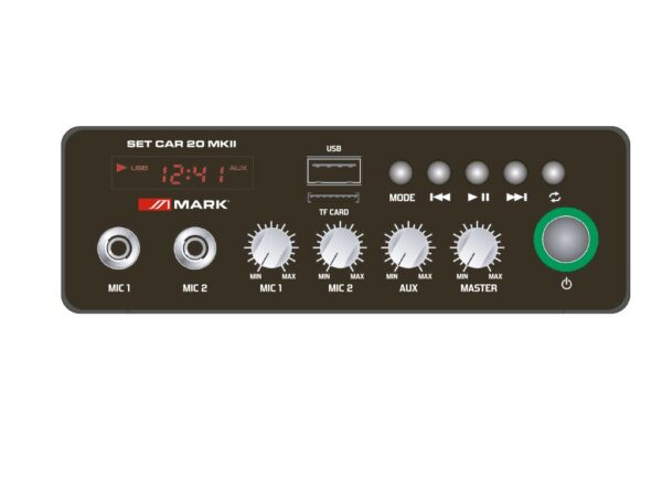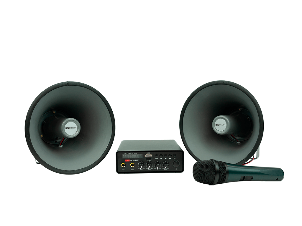Cód. SET CAR 20 MKII MARK – SET CAR 20 MKII – Sistema de megafonía para coche completo -Amplif.30W. 3 entradas MIC/LINE. USB/SD. Micro de mano y mando. 2 bocinas 15W Sistema de megafonía SET CAR 20 mkii es un completo sistema de megafonía de 30 W, que consta de un mezclador/amplificador de 2 entradas de nivel de micrófono y otra auxiliar junto a una interfaz para la reproducción de ficheros de audio externos mediante BLUETOOTH, USB o tarjeta SD. Incluye 2 bocinas de aluminio con asa metálica y un micrófono de mano. Puede ser alimentado mediante corriente alterna de 230…
