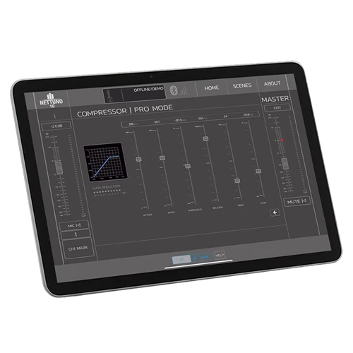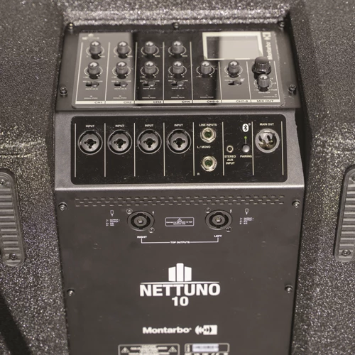 | Controles | Canales de entrada mono: Nivel de efectos de reverberación, Ganancia de entrada, Interruptor de línea/micrófono/HI-Z Canales de entrada estéreo: Ganancia de entrada Control DSP: codificador rotatorio con botón pulsador, Pantalla Control remoto: Aplicación Nettuno 10 |
