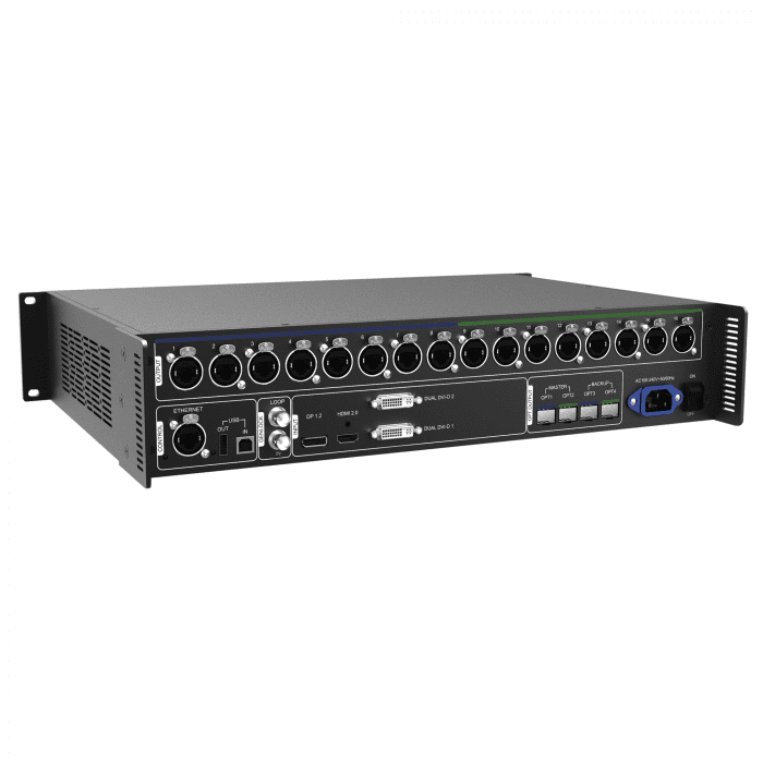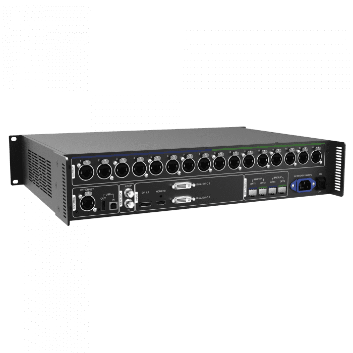 Cód. 101652 Novastar – Phobos MCTRL4K – Caja emisora, Procesador de video Premium Controlador Real 4K Compatible con HDR10 DP1.2/DVI de enlace doble/HDMI 2.0 Profundidad cromática de 8/10/12 bits 16 puertos de salida Gigabit Ethernet El MCTRL4K es un controlador 4K×2K, con una capacidad de carga de hasta 3840×2160 a 60 Hz para cada unidad, que admite cualquier resolución personalizada dentro de este rango, de modo que satisface los requisitos de configuración in situ de las pantallas LED superanchas o de gran tamaño. En el modo multitarjeta, el controlador se puede utilizar como dos controladores independientes de manera que las…