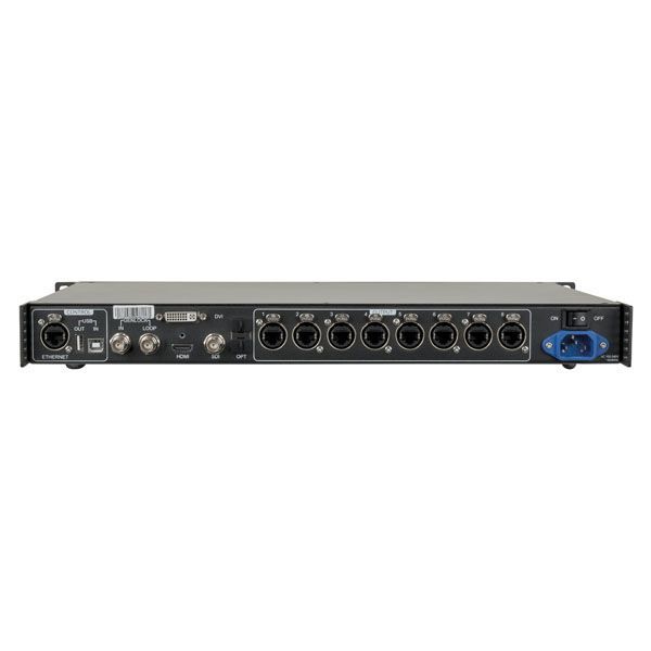 Entradas: interfaz SD0I 6G, HDMI 1.4, Dual DVI Salidas: salidas Gigabit Ethernet de Neutrik de 8 canales, salidas de fibra óptica de 2 canales Control: Ethernet, USB Genlock: Blackburst Fuente de alimentación: 100-240 V CA 50/60 Hz Consumo de energía: 25 W • Temperatura de servicio -20 ~+ 60 Medidas: 482,6 x 330 x 45 mm Peso: 4,6 kg