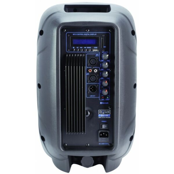 Recinto activo multifunción. 250W de Potencia de Pico – 125W RMS. Clase AB. Altavoz de 10”. Impedancia 8 Ohm. Respuesta de frecuencia 60Hz-20Khz. Ecualizador de dos bandas. Entrada Mic (XLR y Jack1/4″) y Aux IN (RCA)/MP3. Salida Line OUT (XLR). Ecualizador de 2 Bandas. Reproductor de USB, SD, Bluetooth y Radio FM integrado. Control Remoto IR. Pantalla LCD. LED de Encendido y Saturación. Vaso estándar de 1-3/8″ (35mm). Posibilidad de uso como monitor de suelo. Peso aprox 8Kg. Dimensiones 300x 250 x 490 mm.
