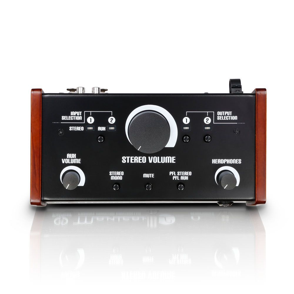 El Monicon L de Palmer es un controlador analógico de volumen muy preciso que se conecta entre un ordenador o equipo de audio y un altavoz de monitorado activo. Su electrónica es totalmente pasiva y no modifica el sonido; los indicadores LED y los amplificadores de auriculares integrados se alimentan por medio del adaptador de corriente suministrado. El Monicon L dispone de una entrada estéreo balanceada con conectores combo, y una entrada AUX por conectores RCA y por minijack estéreo de 3,5 mm. El compacto panel está provisto de salidas XLR para dos pares de monitores y una salida XLR para la suma a mono. El selector de entrada permite activar la entrada estéreo STEREO o la auxiliar AUX, mientras que las dos salidas se pueden activar a la vez o por separado. Además del mando de volumen de gran tamaño, el Monicon L está equipado con botones Mono, Mute y PFL (prefader), una salida de 6,35 mm para auriculares y unos cómodos mandos de volumen para AUX y auriculares independientes.