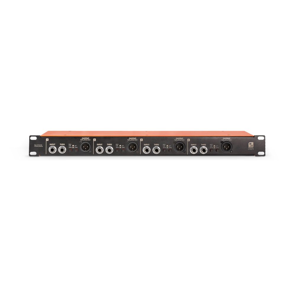 La BRIDGE 4P de Palmer es una caja DI pasiva de 4 canales en formato rack de 19? con transformadores de alta calidad que pueden manejar incluso niveles altos sin distorsión ni pérdida de calidad de sonido. Cada canal está provisto de una entrada jack de 6,3 mm, una salida THRU (para reenviar las señales de entrada a un amplificador, por ejemplo), y dos salidas XLR balanceadas por transformador, una en la parte delantera y otra en la trasera. Con una relación de transmisión de 10 : 1, los transformadores garantizan una impedancia y una adaptación de nivel óptimas para conectar las señales de instrumento de guitarra, bajo, teclado o sintetizador a una entrada de micrófono balanceada. El aislamiento galvánico evita los bucles de masa. Así se mantiene el sonido puro, claro, con muy poco ruido y sin interferencias.