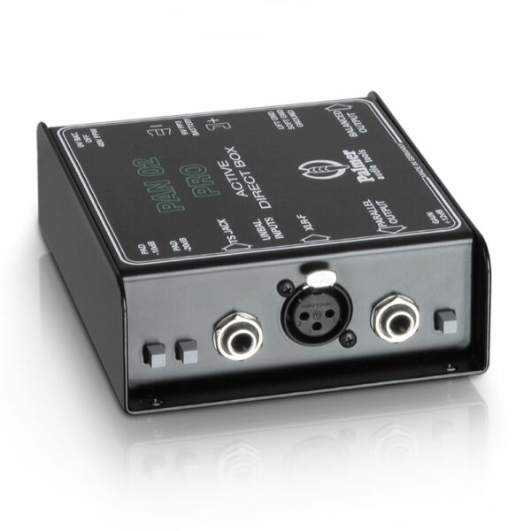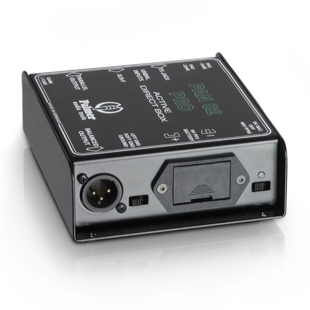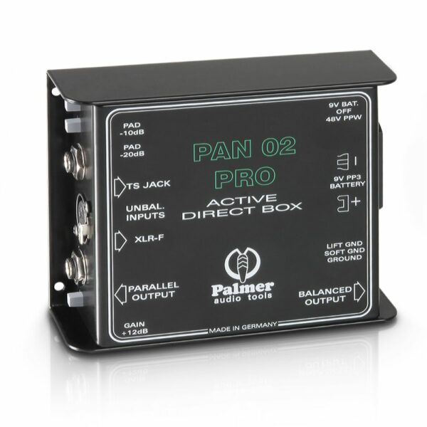 La Palmer PAN02 PRO es una caja de inyección directa activa con unas características adicionales excelentes. Está provista de una entrada XLR no balanceada, un atenuador de 3 niveles (-10, -20 y -30 dB), una ganancia seleccionable de 12 dB, y ofrece un nivel de salida máximo de +20 dBu. El conmutador Ground-Lift, además de la posición «Lift», incluye las opciones «Soft» y «Hard» para aislar la masa. El balanceado de la salida se realiza por medio de un transformador mumetal de alta calidad, especialmente desarrollado. La PAN02 Pro puede funcionar con pilas de 9 V o mediante alimentación fantasma de 48 V. Un LED de dos colores indica qué fuente de alimentación se está utilizando.