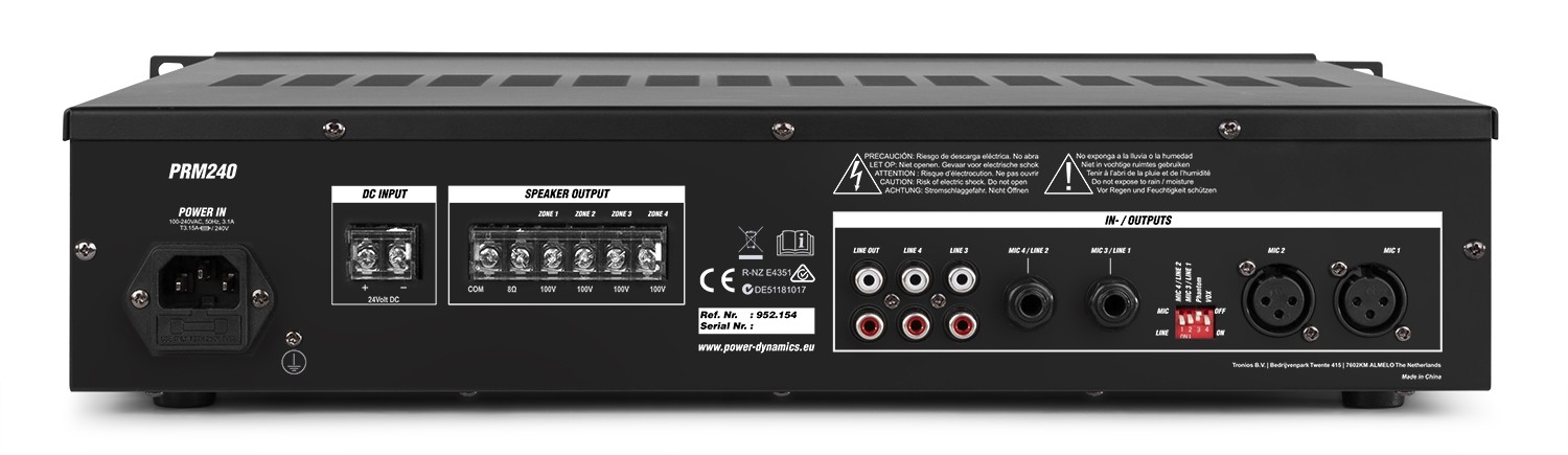 POWER DYNAMICS AUDIO PRM240 – Amplificador línea 100 V. Mezclador multimedia 6 CANALES 4-ZONAS 240W. para instalaciones.