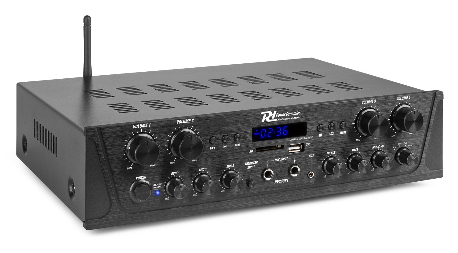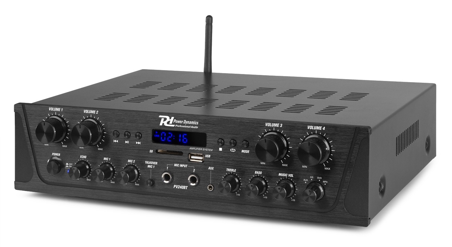 Cód. 953.032 POWER DYNAMICS – PV240BT AMPLIFICADOR DE AUDIO DE 4 ZONAS 400W. DESCRIPCIÓN La serie PV2 son unos amplificadores inteligentes multi-canal equipados con tecnología avanzada inalámbrica BT 4.2 y funciona con cualquier dispositivo incluyendo smartphones, tablets, portátiles y ordenadores. Disfruta de un dulce sonido por streaming desde tu colección digital de música. Todos los modelos ofrecen la posibilidad de mandar música o mensajes a distintos canales deseados (Multiroom) con volumen independiente en cada uno de ellos. Incluye USB/SD card para reproducir MP3/WMA, radio FM con display LED, y dos entradas de micrófono con ajuste de graves/agudos, por lo que…