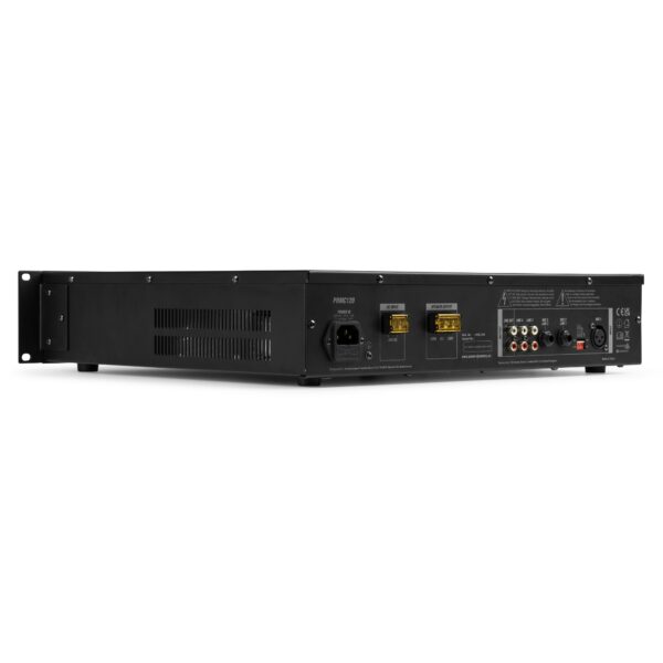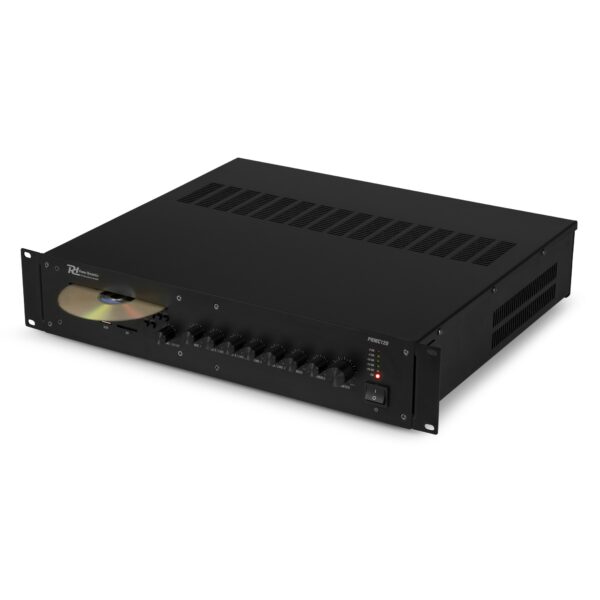 Cód. 952.158 PRC120 – 100V Amplificador mezclador con CD 120W Descripción El PRC120 es un mezclador-amplificador de montaje en rack que se puede utilizar como amplificador de 100 V o como amplificador estándar de baja impedancia. Cuenta con 5 canales de entrada que incluyen una entrada de micrófono XLR balanceada con alimentación phantom conmutable y prioridad de Voz, 2 entradas de jack de micrófono/línea y 2 entradas de línea RCA. Está equipado con un reproductor de CD, receptor BT y puertos USB/SD para reproducción de MP3 con display LCD. El PRC120 cuenta con entradas XLR conmutables con alimentación phantom de 24…