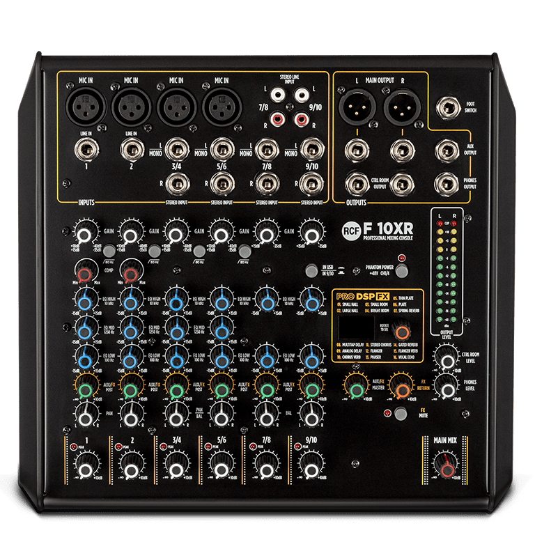 Cód. 17140089 RCF Audio – F 10XR – 90-240V Mesa de mezclas de 10 canales con multiefectos y grabación Características Entradas: 4 preamplificadores de micrófono 2 líneas mono 4 líneas estéreo PRO DSP FX integrado con 16 presets Grabación y reproducción estéreo a través del puerto USB Canales mono con ecualizador de 3 bandas. Ecualizador de 2 bandas en los canales estéreo. Fuente de alimentación universal externa Un auxiliar/efectos (post) Fuente de alimentación universal externa Diseño sólido, compacto y elegante. La serie F de mesas de mezcla de nueva generación de RCF está basada en la amplia experiencia analógica de…
