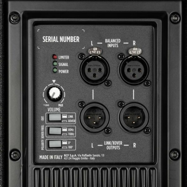 Las mejoras de RCF en el diseño de transductores los hacen más fuertes y más potentes, y el amplificador sigue está evolución. Con sus 1400 W de potencia máxima, el amplificador de Clase D ofrece niveles de presión sonora extremos con un ataque ultrarrápido, una respuesta de transitorios realista y una pérdida por calor muy baja. El diseño del amplificador tiene una gran eficiencia energética, por lo que no necesita ventilador para la refrigeración. El amplificador está acoplado a un disipador de calor de aluminio en la parte trasera de la caja y no tiene partes móviles. El circuito de entrada estéreo con divisor de frecuencia (crossover) presenta un nuevo diseño de baja distorsión con un limitador de seguridad avanzado, para mantener así el auténtico carácter de la señal de entrada a cualquier nivel de volumen. Los amplificadores RCF están diseñados según la normativa EN62368-1 para ofrecer la máxima seguridad, y presentan una sección de fuente de alimentación conmutada que combina alta eficiencia con un mínimo peso.