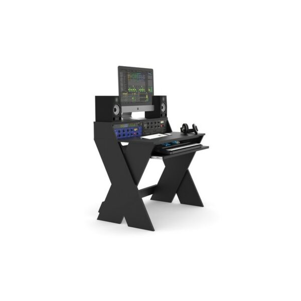 Con este modelo, incluso los productores con espacio limitado podrán disfrutar de todas las ventajas de una estación de trabajo de estudio profesional. Aunque compacto, el hermano pequeño del Sound Desk Pro no escatima en funcionalidad, diseño o estabilidad.Esta estación de trabajo ofrece espacio para monitores de estudio a la altura de los oídos y una pantalla a la altura de los ojos. Justo debajo, proporciona dos espacios para racks de 19″»(48,26cm) de 3U cada uno.Disponible en negro, blanco, y nogal.