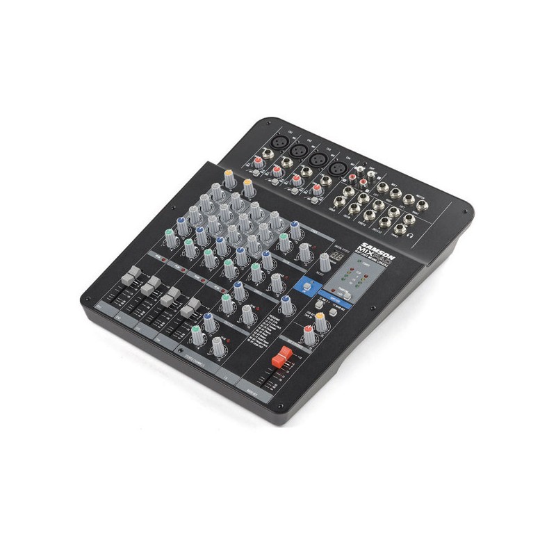 Cód. 025041 SAMSON – MIXPAD MXP124FX – Mesa de mezcla. 12 canales con efectos digitales,4 canales micro / línea, 2 canales mono y 4 canales estéreo. Entradas/salidas RCA adicionales. USB I/O para reproducir/grabar desde ordenador. EQ de 3 bandas por canal. 99 efectos digitales con control de nivel por canal.