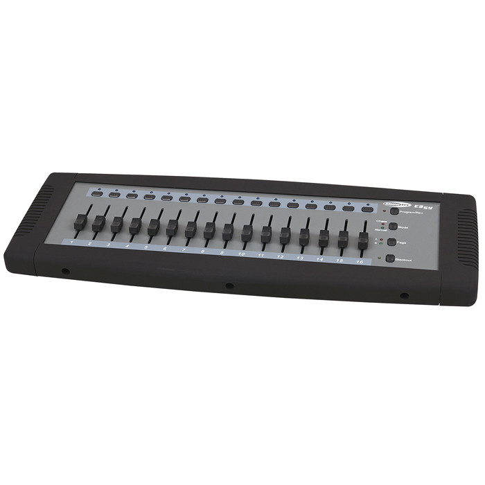 Cód. 50406 Controlador DMX ideal para probar instalaciones o realizar demostraciones 16 canales con fáder 32 canales DMX 16 escenas programables Secuencia incorporada Esta unidad es un controlador DMX programable de 32 canales. Permite programar 12 escenas. Además, dispone de una secuencia, velocidad ajustable, dirección de secuencia y tiempo de fundido. Este controlador de luces es la solución ideal para pequeños espectáculos lumínicos o para probar instalaciones.