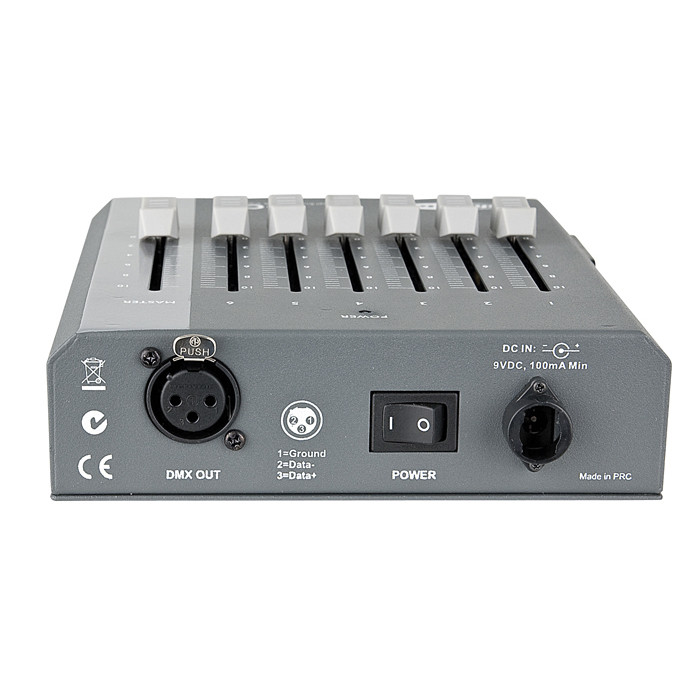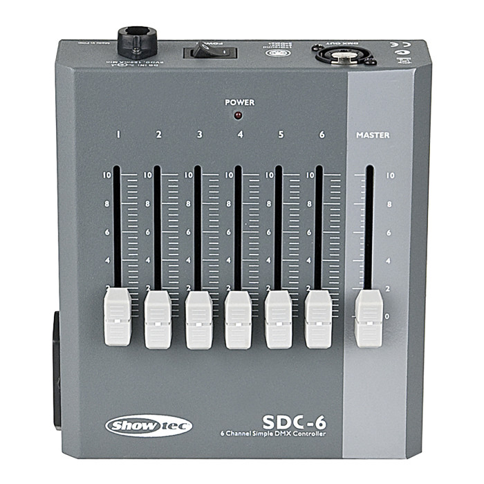 Cód. 50723 Showtec SDC-6 , Mesa de mezclas de 6 canales Controlador DMX compacto de 6 canales Fáder maestro de atenuación Funciona con pila recargable Fácil de usar Ideal para exposiciones La SDC-6 es una consola DMX de 6 canales que funciona con una pequeña batería. Es perfecta para uso en exposiciones o tiendas pequeñas, así como para probar sus equipos DMX. • 6 canales con fáder propio • 1 fáder maestro • 6 canales DMX (del 1 al 6) • Diseño compacto y fácil manejo