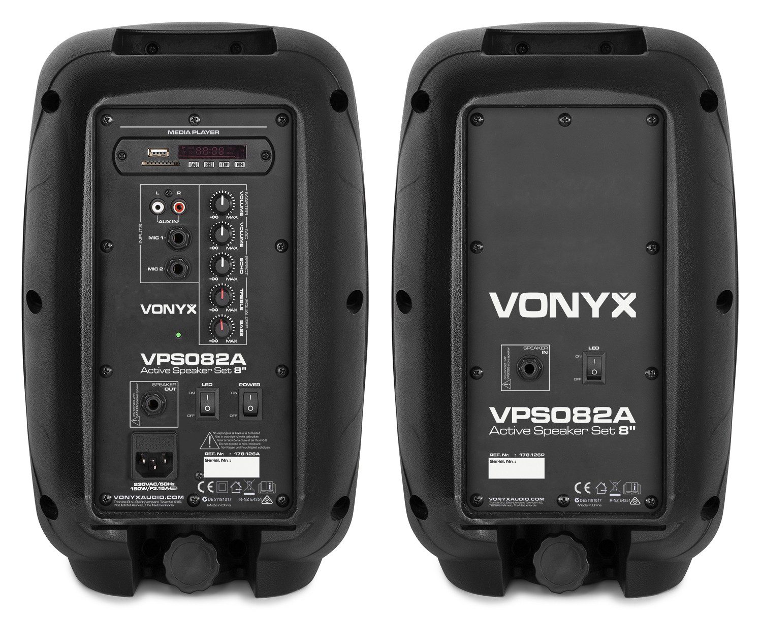 Cód. 178.126 VONYX – VPS082A – Set Plug & Play 400W. 8″, USB, BT, micrófono y mando a distancia DESCRIPCIÓN El VPS082A es un set completo plug & play, listo para empezar tu fiesta. El set contiene una pareja de bafles 8″ uno activo y otro pasivo. En los modelos activos, el amplificador integrado incorpora reproductor USB/SD para ficheros MP3 y receptor BT para audio streaming de tu música desde Smartphone o tabet. Ambos altavoces incorporan un aro de LED azul para dar color al woofer y iluminar tu fiesta. Completando este kit se entrega con micro de cable para…