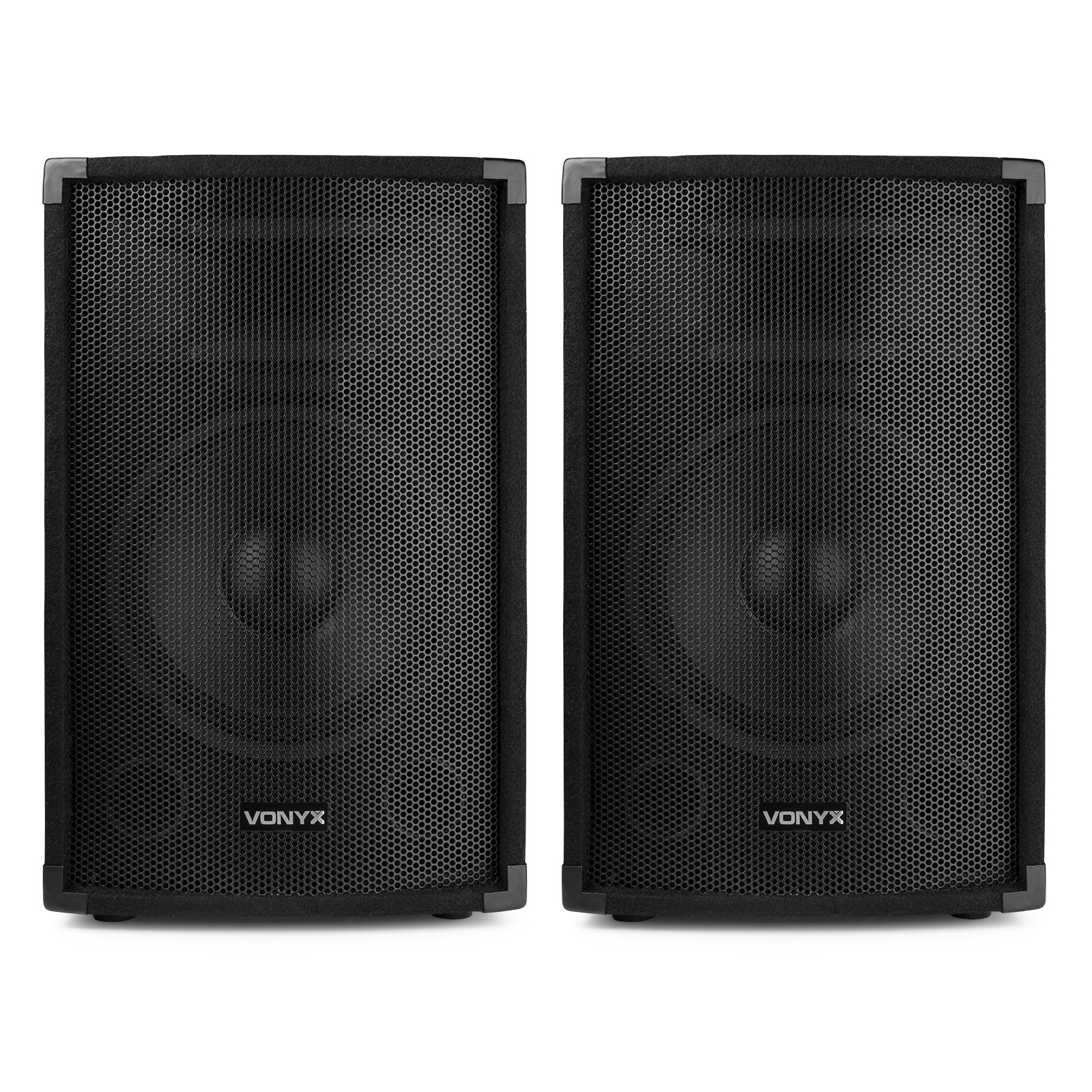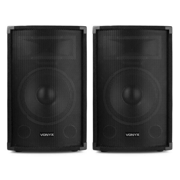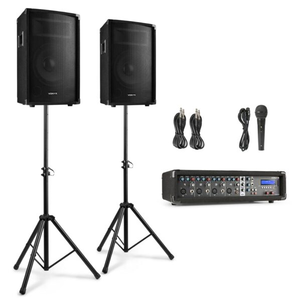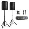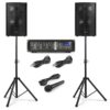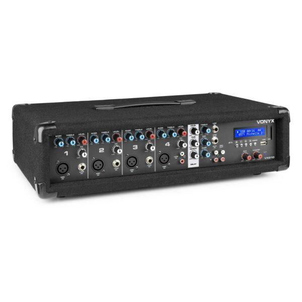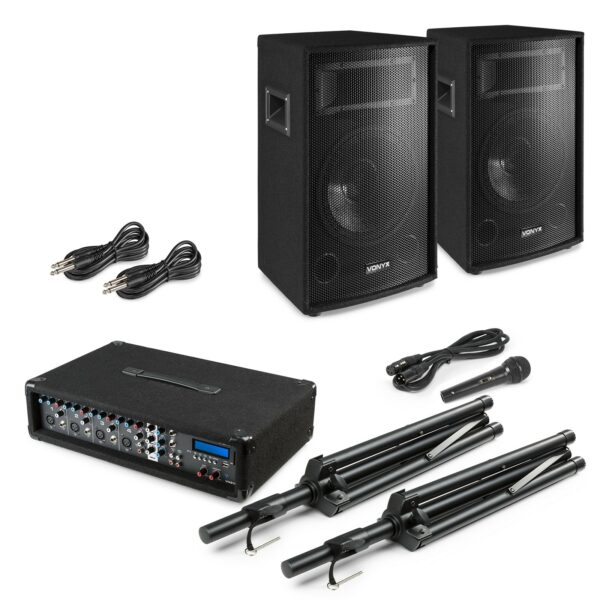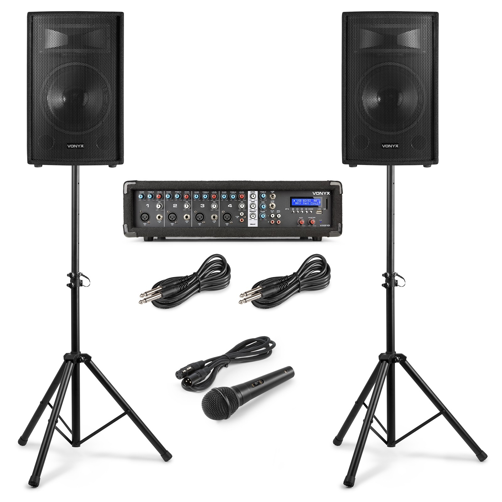 Cód. 170.110 VONYX – VX210 – SISTEMA COMPLETO PA, Amplificador integrado Clase-D 800W Receptor BT para audio streaming 4 entradas balanceadas de micrófono DESCRIPCIÓN El VX210 es un sistema de sonido PA completo que incluye un mezclador de 4 canales con amplificador y reproductor multimedia, dos altavoces full range de 10” y todos los accesorios necesarios. El sistema también incluye un micrófono con cable y dos soportes para altavoces, lo que lo convierte en un sistema plug and play completo. El mezclador de 4 canales con amplificador y BT se adapta a una gran variedad de aplicaciones, como Live PA,…