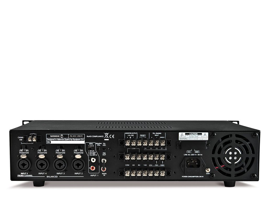 Compatible con altavoces de baja impedancia (4, 8 y 16 ohm) y alta impedancia (25, 70 y 100 V Line).