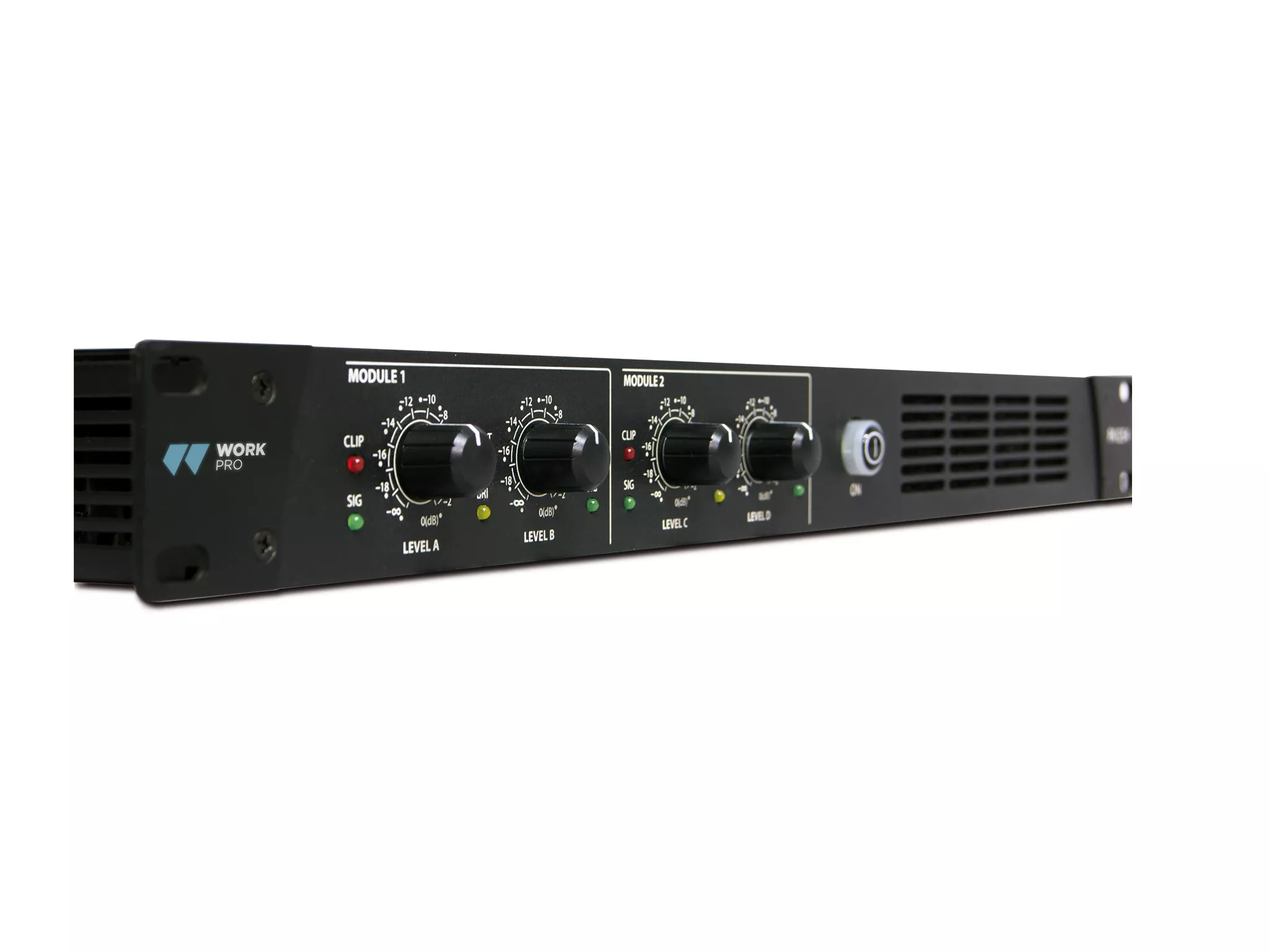 Work pro – PA 1254 – Amplificador audio. 4 x 150 W @ 4 Ohm. 9 modos de funcionamiento. Crossover para salida subgrave.