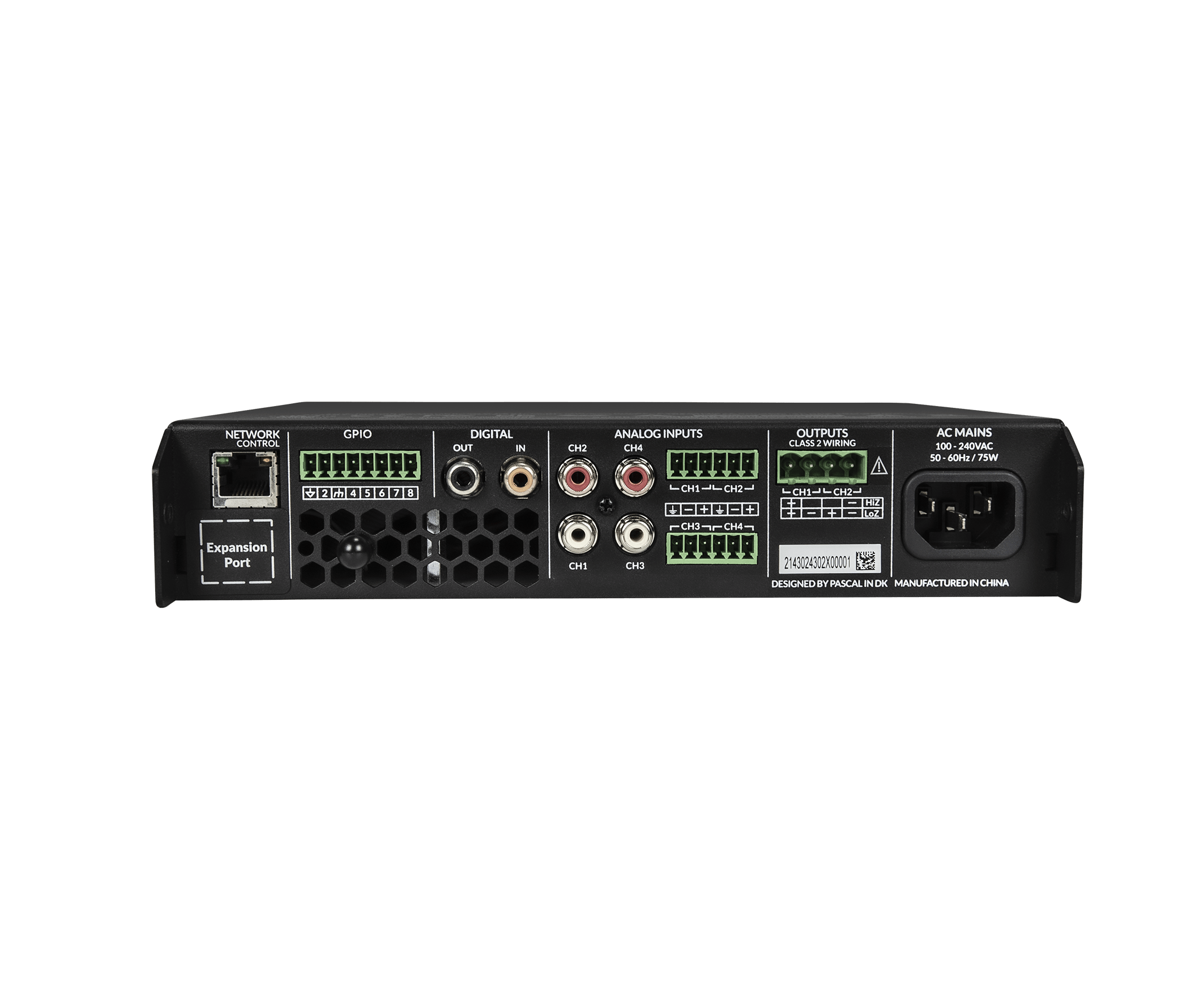 Amplificador compacto de instalación de dos canales de 4 ohm (hasta 125W por canal) o 250W en una salida de línea 100V. Entrada y salida digital de señal para facilitar su interconexión sin conversiones. DSP dedicado con conectividad y control total vía Wi-Fi autónoma. Ethernet y GPIO