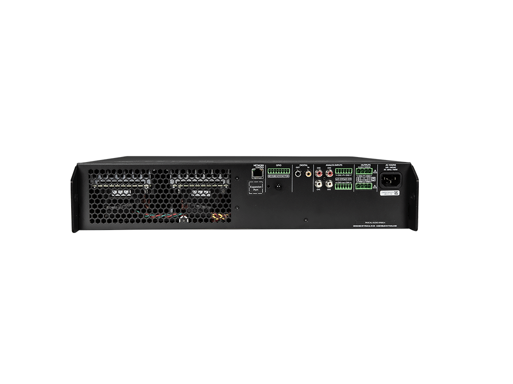 Amplificador compacto de instalación de cuatro canales de 4 ohm (hasta 500W por canal) o 1000W en cada una salida de  sus 2 salidas de línea 100V. Entrada y salida digital de señal para facilitar su interconexión sin conversiones. DSP dedicado con conectividad y control total vía Wi-Fi autónoma. Ethernet y GPIO